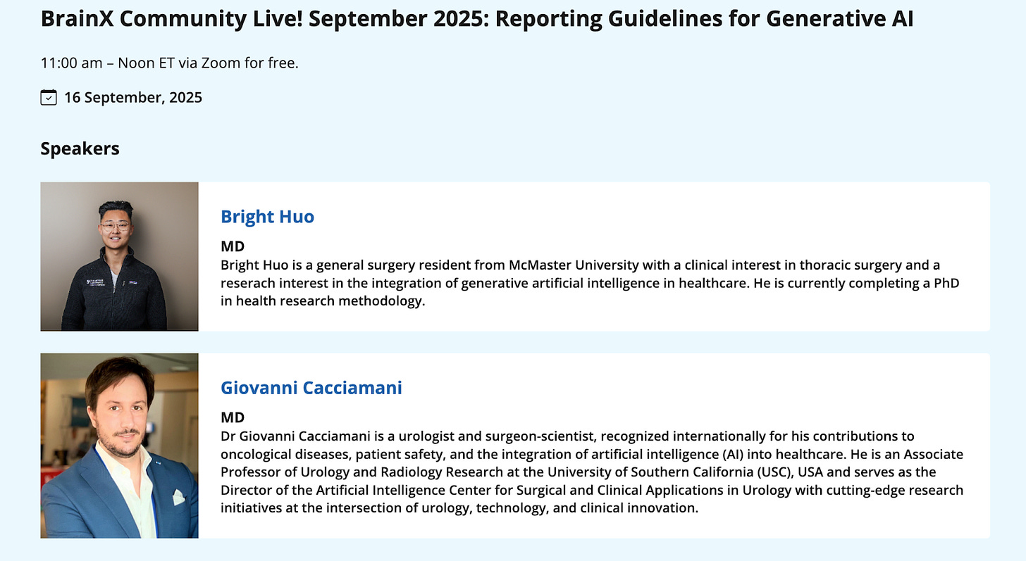 Register to join our upcoming BrainX Community Live event themed, ‘Reporting Guidelines for Generative AI’, on September 16, 2025; 11am - noon ET via Zoom for free. This event will feature Bright Huo MD & Giovanni Cacciamani MD, who will present the recent CHART reporting guidelines, and we will discuss other reporting guidelines for Generative AI research and publication.
